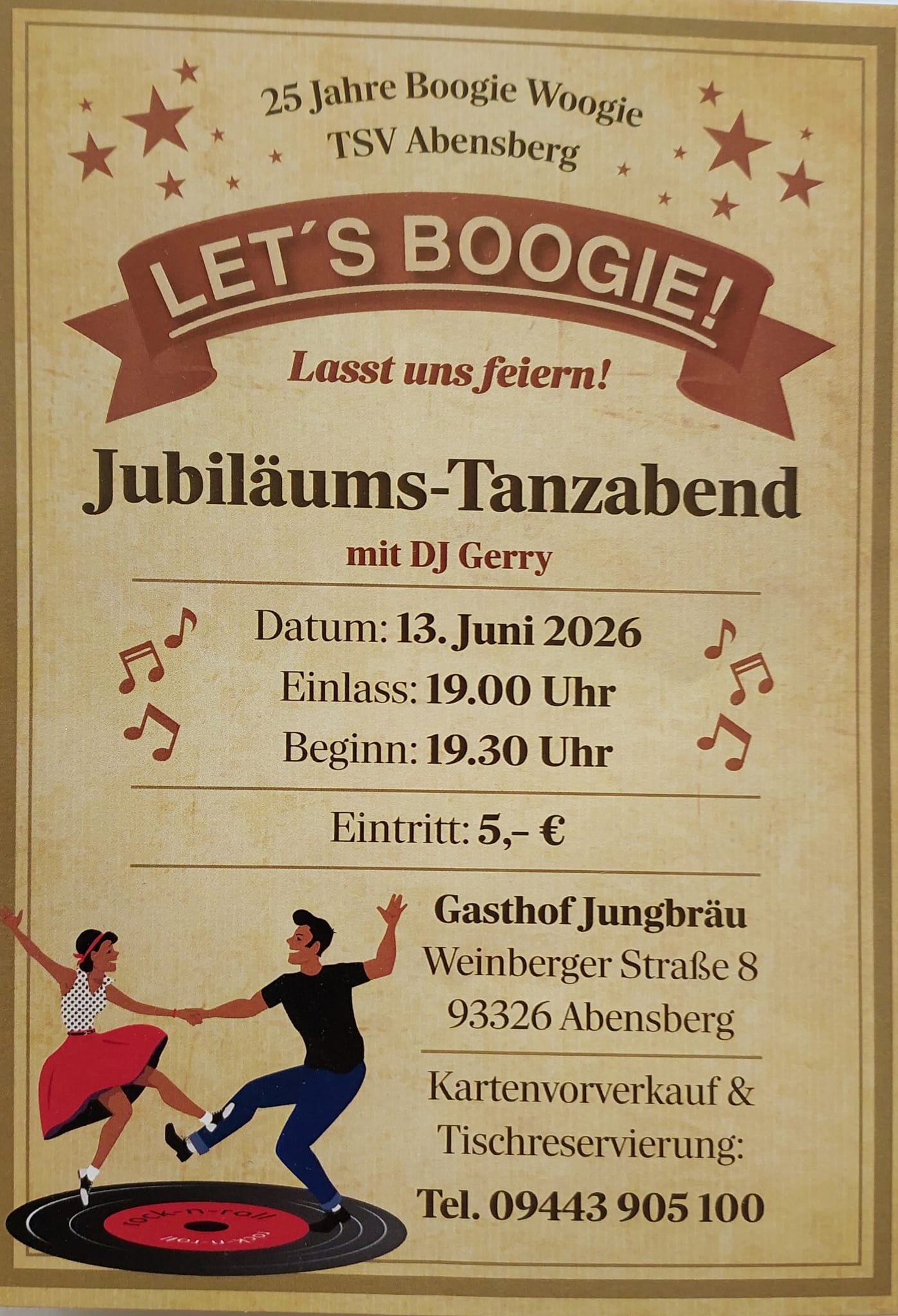 Let’s Boogie 13. Juni @ 19:00 - 23:30 Gasthof Jungbräu Weinbergerstraße 8, Abensberg, Bayern, Germany 25 Jahre Boogie Woogie TSV Abensberg €5